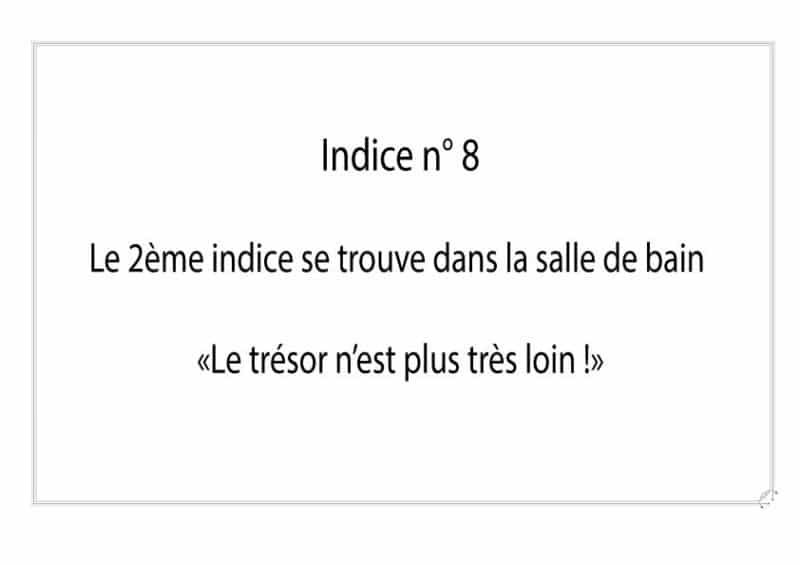 - Les cachettes prévues pour chaque indice (respectez l’ordre pour éviter toute confusion)